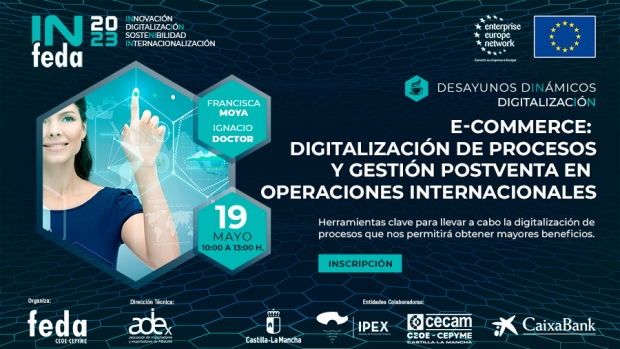 La Confederación de Empresarios de Albacete (FEDA), como miembro de la Enterprise Europe Network, organiza en su sede este desayuno el 19 de mayo donde veremos, de una manera práctica y visual, diferentes herramientas que nos pueden ayudar en el proceso de digitalización y de gestión del servicio postventa, según nuestro sector y objetivos, lo que nos permitirá la optimización de nuestra expansión internacional.